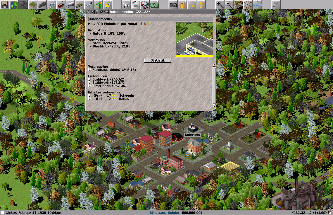 Ich suche mir nun, entweder indem ich mit dem Mausrad herausscrolle oder per Karte (kann mit M angezeigt werden), die größte Stadt auf der Karte heraus. Manchmal haben diese Städte direkt Industrien anbei. Diese kann man daran erkennen, dass die Gebäude einfach ziemlich groß sind im Gegensatz zu den Stadtgebäuden. Auf meiner Karte ist dies Schwerin, und direkt in der Nähe gibt es einen Autohersteller. Da müssen doch bestimmt Arbeiter hin. Kann man auch herausfinden, indem man das Werk anklickt – eine Zahl neben dem Männchen-Icon zeigt die Arbeiter aus einer bestimmten Stadt.
