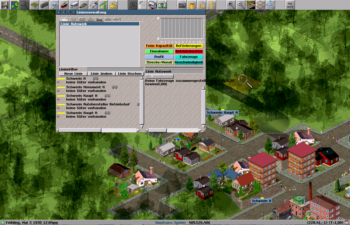 Ich habe meine Stadt nun mit Haltestellen ausgestattet und die Straße oben am Werk ebenso. Nun klicke ich in der Menüleiste ganz oben auf Linienverwaltung (man kann auch W drücken). Hier befindet sich schon der erste Fallstrick: Man muss oben erst den Reiter für Straße auswählen, bevor eine neue Linie erstellt werden kann. Nun drücke ich auf Neue Linie.